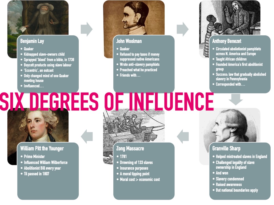 The process then follows the Small World theory – or ‘six degrees of separation’ as many of us would understand it. One of the minds he influenced was John Woolman who in turn was friends with Anthony Benezet (both Quakers) who corresponded with a man in the UK called Granville Sharp. Sharp was well connected, including to the court of George III, and conducted the first sustained campaign against slavery (along with Benezet and John Wesley). This included introducing three African men, freed slaves, to London society; a process which helped develop a critical mass of awareness amongst those who could effect (and would be most affected by) the end of the slave trade.