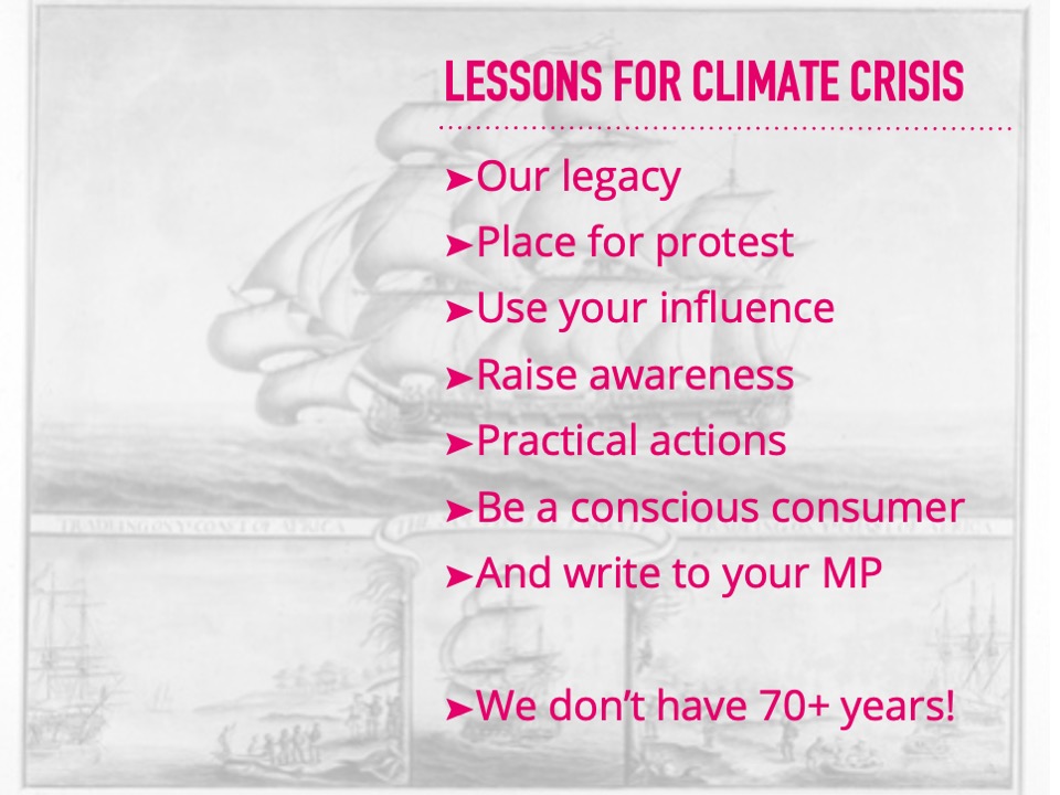 … was one of the messages held at Southwell’s COP26 Climate March. This chimed with part of a talk we gave recently to the U3A which considered what can be learnt from the abolition of the Atlantic slave trade, to help accelerate the response to the climate crisis.