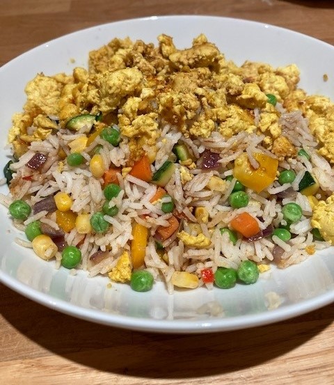 - Serve the vegetable rice in large bowls with the remaining tofu ‘egg’ sprinkled over the top.